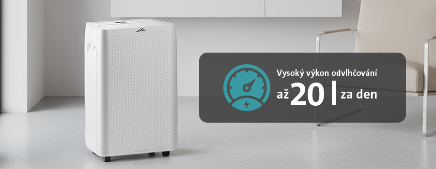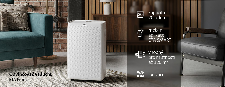 Odvlhčovač vzduchu ETA Primer je spoľahlivým riešením pre domácnosti aj kancelárie, ktoré trápia nadmerná vlhkosť. Dokáže znížiť vlhkosť v miestnostiach do 100 m2 a tým účinne obmedzuje vznik plesní a zatuchnutého prostredia. Vďaka výkonu odvlhčovania až 20 litrov za deň (pri 30 ° C a vlhkosti 80%) a prúdeniu vzduchu až 120 m3 za hodinu zaistí zdravšiu a sviežejšiu klímu, ktorá podporí aj funkcie ionizácie. Ponúka tri režimy prevádzky a dve rýchlosti fúkania, ktoré si ľahko prispôsobíte svojim potrebám. Odvlhčovač môžete jednoducho ovládať priamo na prístroji alebo doslova odkiaľkoľvek cez mobilnú aplikáciu ETA SMART v slovenčine. Vďaka nádržke na vodu s objemom 4,5 litra, možnosti trvalého odtoku kondenzátu aj praktickým kolieskam je ideálnou voľbou pre pohodlný a zdravý domov.
