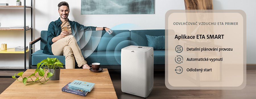 Veľkou výhodou je možnosť šikovného ovládania prostredníctvom mobilnej aplikácie ETA SMART, ktorá je k dispozícii v slovenčine. Vďaka tomu môžete mať prevádzku odvlhčovača vždy pod kontrolou, či už ste doma, v práci alebo na cestách. Aplikácia ETA SMART umožňuje nielen základné zapnutie a vypnutie zariadenia na diaľku, ale aj detailné plánovanie prevádzky. K dispozícii je aj časovač, ktorý umožňuje nastaviť odložený štart alebo automatické vypnutie v rozmedzí 1–24 hodín.