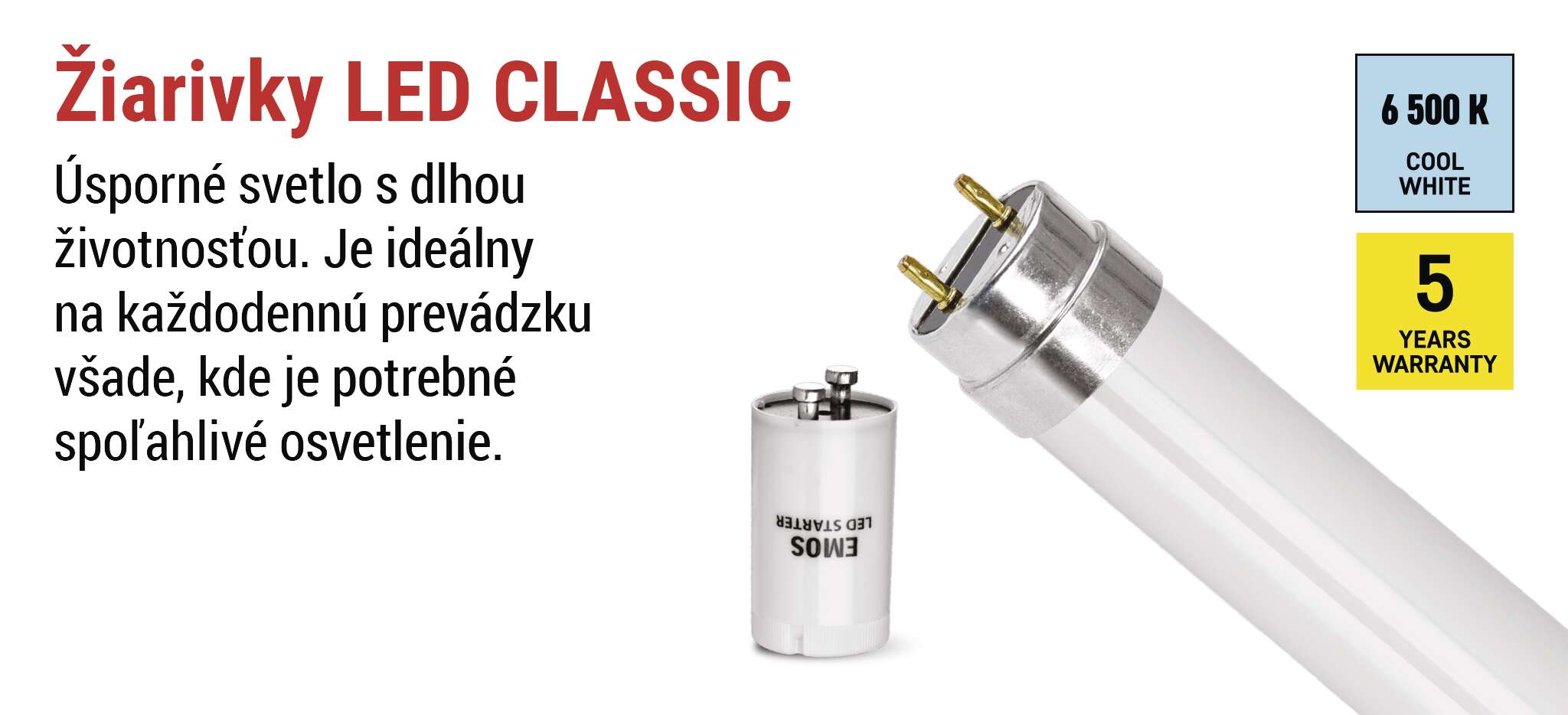 S LED žiarivkami EMOS získate všetko potrebné na okamžitú inštaláciu. LED štartér je už súčasťou dodávky, takže výmena starej žiarivky za novú je rýchla, bezpečná a bez potreby ďalších úprav. Stačí vymeniť pôvodnú trubicu a štartér a za pár minút si môžete užívať moderné, úsporné a spoľahlivé osvetlenie.